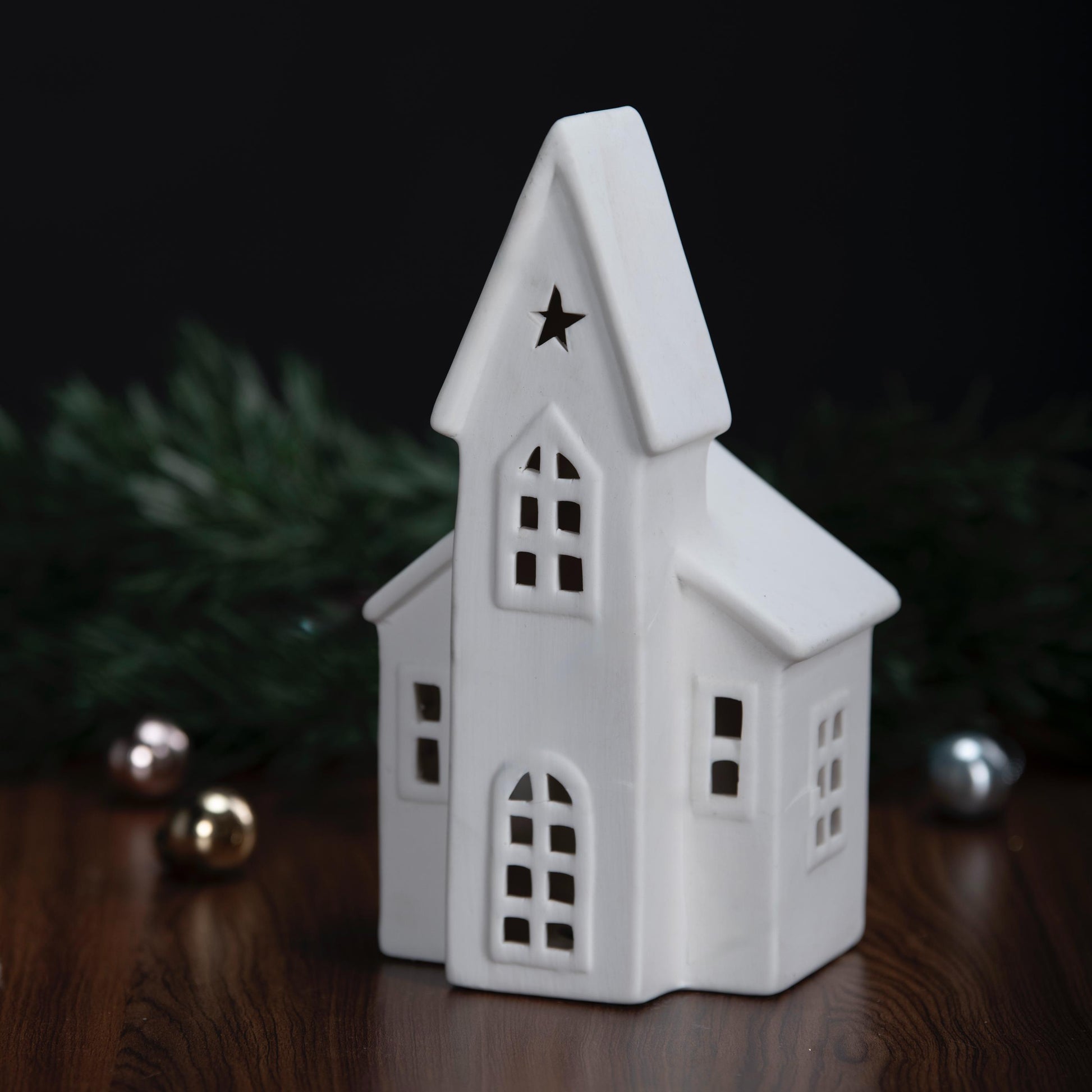 Graceful and timeless, The Chapel of Light captures the serene spirit of Christmas nights aglow. Crafted in smooth ceramic with delicate window cutouts and a star crowning its steeple, it radiates a warm, gentle light when paired with a tea light.