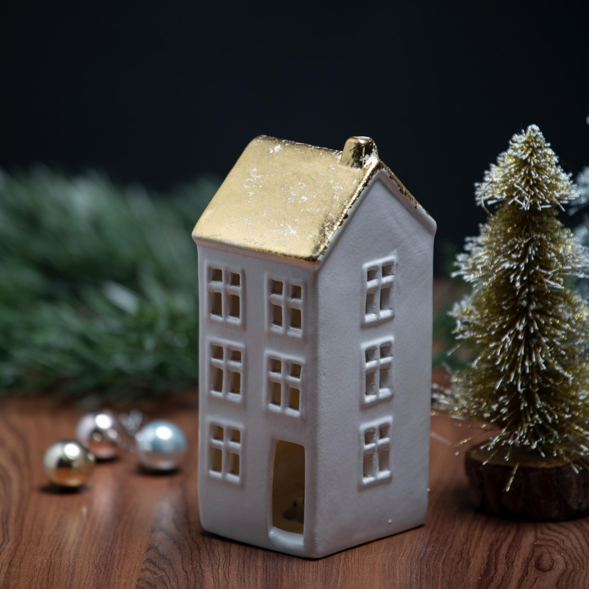 Crafted in smooth white ceramic with a shimmering gold-foil roof, it features an in-built light that radiates a soft, golden warmth through its windows. Perfect for adding a touch of festive sparkle to mantels, consoles, or your Falala Winter Village display, it’s a timeless piece that shines all season long.
