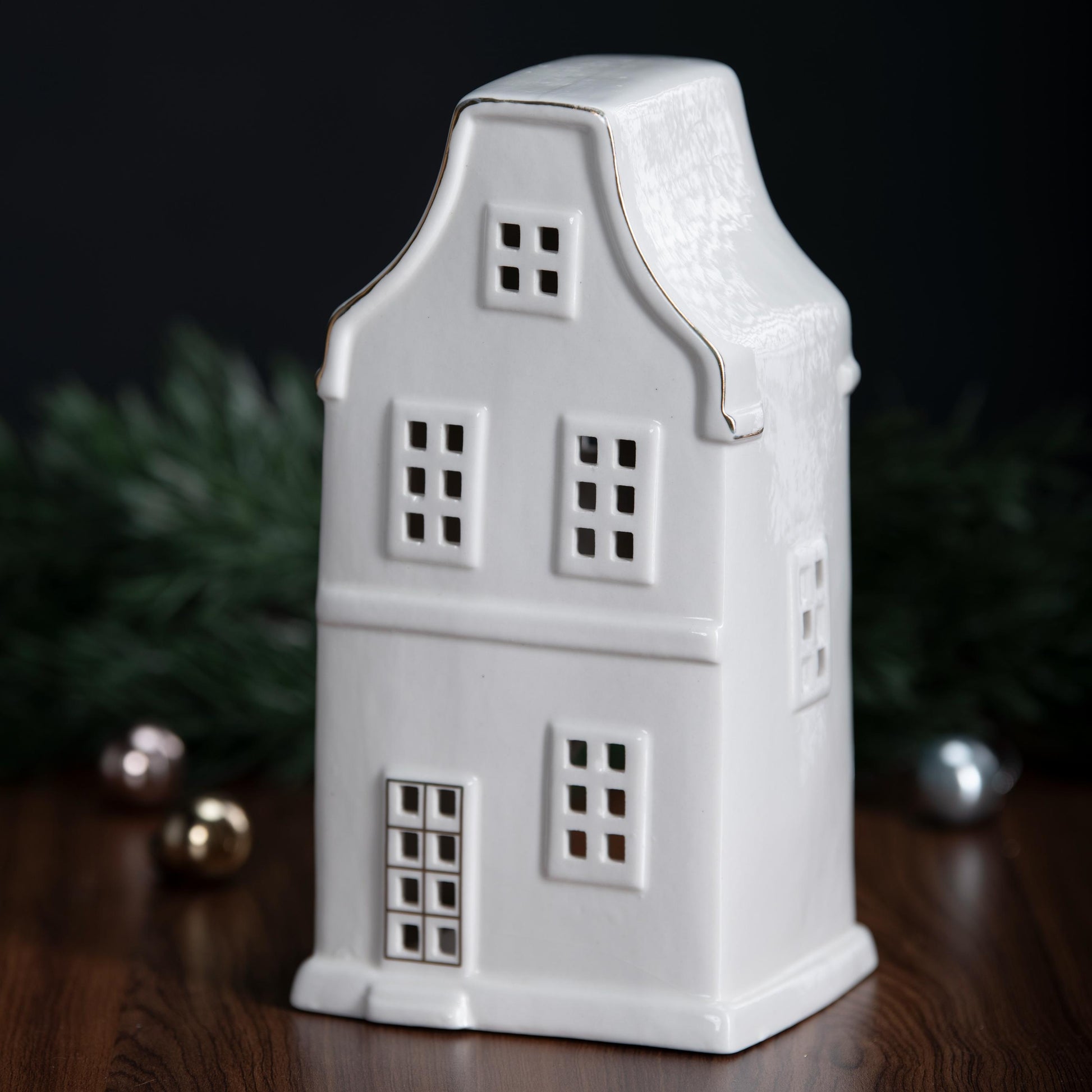 Tall, graceful, and beautifully architectural with those curved gables and warm inner glow. It has that refined European townhouse elegance (a touch of Amsterdam, a hint of Paris), and the gold-trimmed detailing gives it the perfect touch of luxury.